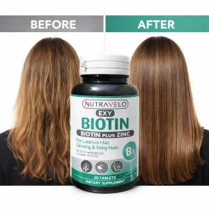 Biotin Plus Zinc Tablets are a premium dietary supplement designed to support healthy hair growth, radiant skin, and strong nails from within. In today’s fast-paced lifestyle, nutritional gaps can lead to hair thinning, dull skin, and brittle nails. Nutravelo EXY Biotin Plus Zinc Tablets provide a targeted formula that helps nourish your body with essential nutrients required for beauty and overall wellness.