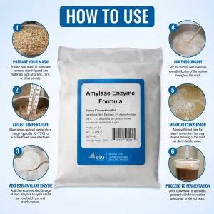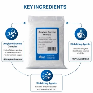 BSG Amylase Enzyme rapidly breaks down complex starches, improving sugar availability for fermentation and increasing overall yield.