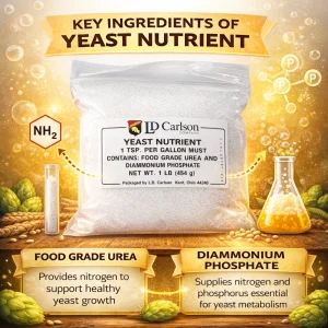 LD Carlson Yeast Nutrient accelerates fermentation by supplying essential nutrients, helping yeast convert sugars into alcohol more effectively.